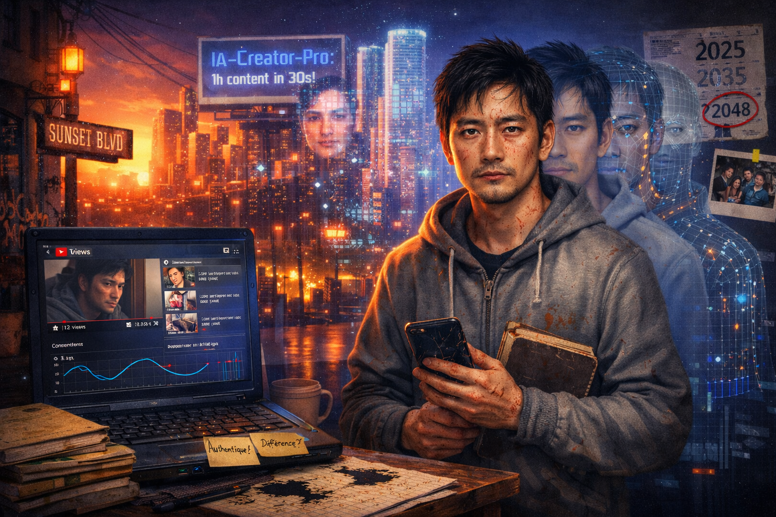 Kael Nakamura traversait Sunset Boulevard comme on traverse un fleuve de fantômes numériques, son téléphone scintillant dans la pénombre avec ces chiffres qui le hantaient depuis des semaines : douze vues. Trente-deux ans, le visage marqué par l’éclairage bleuté des écrans et les nuits blanches passées à traquer les dernières traces d’humanité dans l’océan de données, il fixait le result de trois mois de travail condensés en quarante-sept minutes de témoignages. Douze vues, mais étaient-elles humaines ? Cette question avait cessé d’être philosophique pour devenir une urgence pratique, une équation qu’il ne savait plus résoudre.